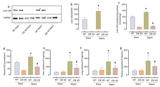 CSE-derived H2S regulates SP following CLP-induced sepsis. (a–d) Increased liver CSE expression (a) and quantification of CSE in ‘a’ (b), liver H2S-synthesizing activity (c) and plasma H2S levels (d) following CLP-induced sepsis. (e–g) Genetic deletion of CSE significantly decreased SP levels in liver (e), lung (f) and plasma (g) compared to WT mice following sepsis. Data represented as mean ± S.E.M. (n = 8). The significance of differences among groups was evaluated by ANOVA with post-hoc Tukey’s test. Statistical significance was assigned as p < 0.05 (* p < 0.05 vs. WT sham; # p < 0.05 vs. WT sepsis).
