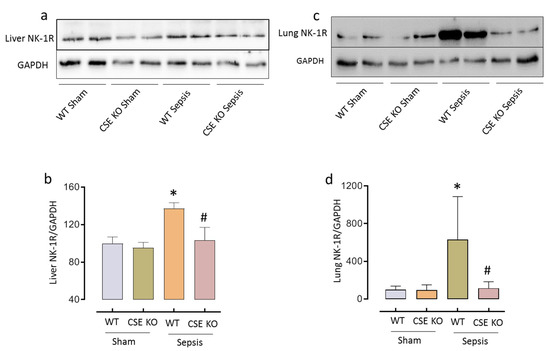 Densitometry analysis of western blots showed that liver and lung NK-1R protein expression increased significantly following sepsis (* p < 0.05 vs. WT sham). Decreased H2S levels following CSE gene deletion significantly decreased sepsis-induced NK-1R expression (# p < 0.05 vs. WT sepsis) (Figure 2).