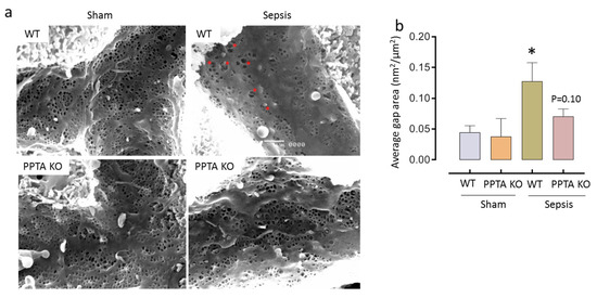 Scanning electron micrographs showed that CLP-induced sepsis promote decrease in LSEC fenestration frequency and porosity and increased gaps formation, compared to WT sham (gap area: 0.12 ± 0.02 nm2/mm2 vs. 0.06 ± 0.01 nm2/mm2; * p < 0.05 vs. WT sham). Mice, deficient in the PPTA gene had preserved LSEC morphology (fenestration frequency and porosity) and fewer gaps with sepsis, than WT with sepsis (gap area: 0.09 ± 0.01 nm2/mm2 vs. 0.12 ± 0.02 nm2/mm2) (Figure 3 and Table 1).