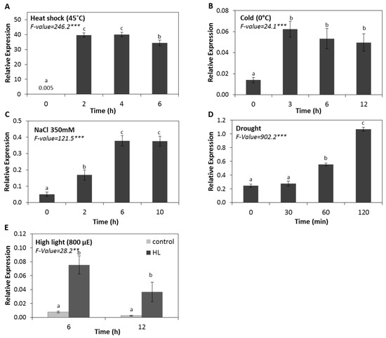 Effect of various abiotic stress treatments on HSP17.4CI expression in Arabidopsis. (A) heat (45 °C), (B) cold (0 °C), (C) salt (350 mM), (D) drought (plants kept on dry filter paper), (E) high light (800 µmol photons.m−2.s−1). Data represents the average and SDs from three biological replicates. F-values represent one-way ANOVA. **: p < 0.01, ***: p < 0.001. Means with different letters are significantly different at p < 0.05 according to the Tukey HSD test. For panel (E), different letters at the same time point indicate significant differences.