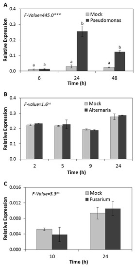 Effect of various biotic stress treatments on HSP17.4CI expression in Arabidopsis. (A) Pseudomonas syringae, (B) Alternaria brassicicola, (C) Fusarium oxysporum. Shown are average values and SDs of three biological replicates. F-values represent one-way ANOVA. ***: p < 0.001, ns: not significant. Means with different letters at each time point are significantly different at p < 0.05 according to the Tukey HSD test.