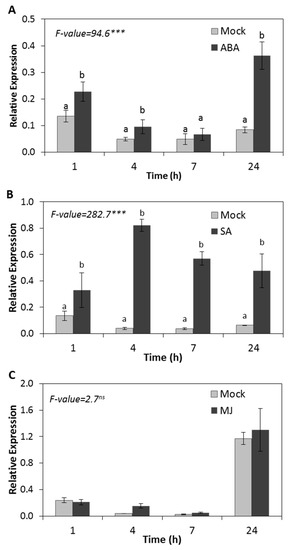 The plant hormone SA is known to be involved in plant growth and development and plays a role during defense against biotrophic pathogens [48]. To investigate the possible involvement of SA in the induction of HSP17.4CI by the biotrophic pathogen P. syringe (Figure 2A), we analyzed HSP17.4CI expression in plants treated with SA. Our results show that treating Arabidopsis seedlings with SA significantly induced HSP17.4CI at all of the examined time points (Figure 3B). These results are consistent with the induction of this sHSP by the biotrophic pathogen, P. syringae (Figure 2A) that activates SA signaling [49]. In contrast to ABA and SA, MJ treatment showed no significant effect on HSP17.4CI expression in the treated Arabidopsis plants at any of the investigated time points (Figure 3C). This result is in line with the finding that the expression level of this gene was not affected by the necrotrophic pathogens A. brassicicola and F. oxysporum (Figure 2B,C), to which the MJ signaling pathway is known to be involved in plant defense [49].
