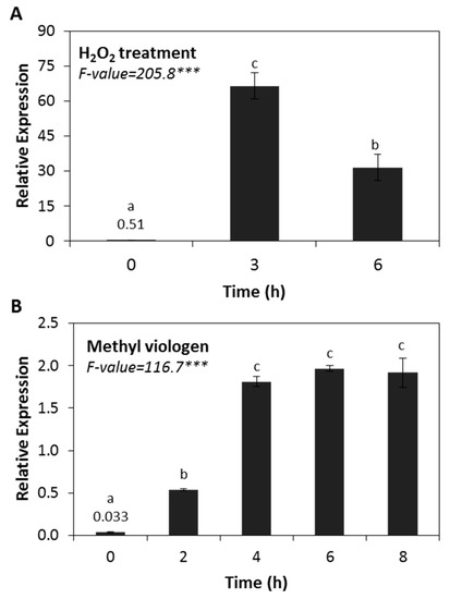 Effect of various oxidative stress treatments on HSP17.4CI expression in Arabidopsis. (A) H2O2 treatment (500 mM), (B) methyl viologen treatment (30 µM). Shown are average values and SDs of three biological replicates. F-values represent one-way ANOVA. ***: p < 0.001. Means with different letters are significantly different at p < 0.05 according to the Tukey HSD test.