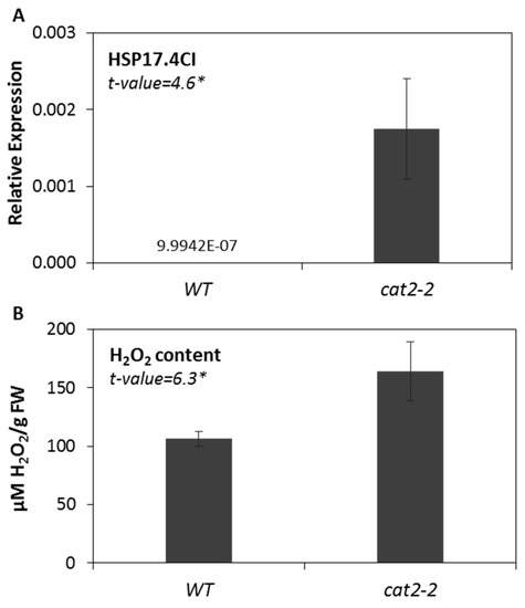 The expression level of HSP17.4CI (A), and H2O2 content (B) in wild type (WT) and cat2-2 mutant Arabidopsis plants. For HSP17.4CI expression experiment, data represents the average and SDs of three biological replicates. For H2O2 quantification experiment, two biological replicates, with three technical replicates each were used. t-values represent Student’s t-test. *: p < 0.05.