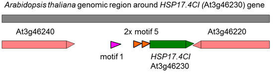 Schematic representation of a 4kb long genomic region surrounding At3g46230 (HSP17.4CI, green). Genes are represented as boxes with indicated gene orientation. The identified oxidative stress motifs in the promotor region are highlighted in pink (Motif 1, existed once) and orange (Motif 5, existed twice and indicated as 2x).