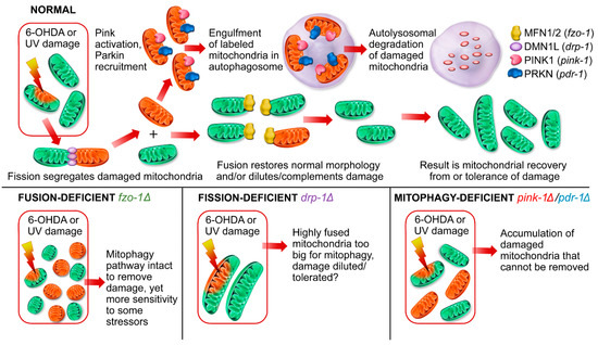 - Bess, A.S.; Crocker, T.L.; Ryde, I.T.; Meyer, J.N. Mitochondrial dynamics and autophagy aid in removal of persistent mitochondrial DNA damage in Caenorhabditis elegans. Nucleic Acids Res. 2012, 40, 7916–7931. [Google Scholar] [CrossRef] [PubMed]