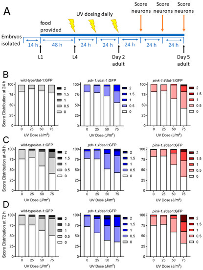 2.2.1. Exposure to UVC Caused more Neurodegeneration when Mitophagy was Blocked in pink-1 or pdr-1 Mutants