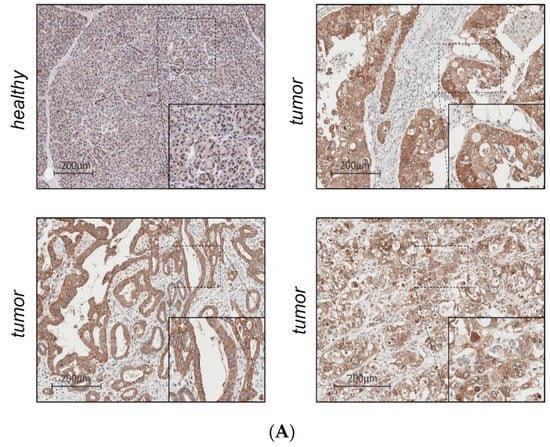 Preprocessed and normalized data from the RNA microarray GEO datasets GSE28735 [24,25], GSE43288 [26], and GDS4329 [27] were analyzed. In GSE28735 differential gene expression was analyzed between PDAC and non-tumor tissues (n = 45 each). Pearson correlation was applied to detect possible co-expressions between genes of interest and other genes in the dataset (threshold: R2 ≥ 0.75 or ≤−0.75, respectively).
