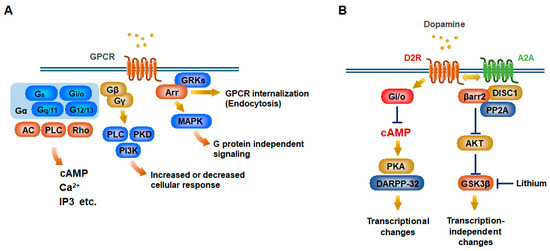 Schematic illustration of G protein-coupled receptor (GPCR) signaling. (A) Canonical G protein-coupled receptor (GPCR) signaling occurs through heterotrimeric G proteins (Gα, Gβ, and Gγ). Upon GPCR activation, the Gα and Gβγ subunits dissociate and can induce each downstream signaling. Gα proteins can be subdivided into four types of families with different signaling components including adenylyl cyclase (AC) for Gs and Gi, phospholipase C (PLC) for Gq, Rho for G12. Gβ and Gγ subunits further diversify into distinct signaling responses such as PLC, phosphatidylinositol 3-kinase (PI3K), and protein kinase D (PKD) pathways. In a noncanonical GPCR pathway, arrestins (Arr) bind to the activated receptor that has been phosphorylated by G protein-coupled receptor kinases (GRKs). This leads to desensitization of G protein signaling by the receptor internalization and endocytosis. Meanwhile, this signaling can elicit additional intracellular responses including mitogen-activated protein kinase (MAPK) activation. (B) D2 dopamine receptor (D2R) activation stimulates a Gi/o protein that decreases intracellular cAMP in striatopallidal medium-sized spiny neurons (MSNs). This negatively regulates protein kinase A (PKA)/dopamine and cAMP-regulated phosphoprotein of 32 kDa (DARPP-32) signaling, eventually leading to transcriptional changes. D2R activation also facilitates its interaction with adenosine A2a receptor (A2A) and DISC1 (disrupted in schizophrenia 1) and induces β-arrestin2 (βarr2) signaling via heterodimeric D2R/A2A, which inhibit protein kinase B (AKT) activity. AKT phosphorylates glycogen synthase kinase 3 beta (GSK3β) to prohibit its activation. Mood stabilizer lithium negatively regulates GSK3β activation and interferes with interaction between βarr2 and AKT.