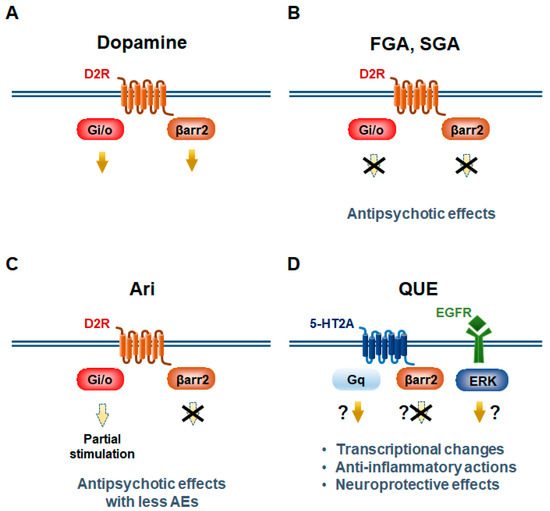 Proposed antipsychotic actions to confer bias of GPCR signaling. D2R-mediate Gi/o and β-arrestin2 (βarr2) pathways in striatopallidal MSNs (A–C). First-generation (FGA) and second-generation antipsychotics (SGA) antagonize both of these two pathways (B). Aripiprazole (Ari) functions as a partial agonist/antagonist at D2R-Gi/o signaling, whereas it fully antagonizes D2R-βarr2 signaling (C). Quetiapine (QUE) blocks 5-HT2A-βarr2 signaling and activates 5-HT2A-Gq signaling. Quetiapine also activates epidermal growth factor receptor (EGFR)-ERK pathway (D).