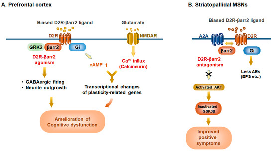 A series of observations obtained by biased D2R ligands indicate that a functionally selective compound, which activates D2R-βarr2 pathway and reduces Gi activity in hypodopaminergic PFC while simultaneously blocking D2R-βarr2 pathways in hyperdopaminergic striatum, would exhibit beneficial effects on schizophrenic symptoms (Figure 4). It is intriguing how such a compound can affect short- and long-term neural plasticity. The regulation of D2R activity causes two types of cellular events, gene transcription-dependent and independent signal transduction mediating long-lasting and acute synaptic plasticity, respectively. The transcription-dependent event is mainly caused by reduction of D2R-Gi/o signaling, resulting in intracellular cAMP increase. This in turn activates not only PKA-dependent cellular events but also NMDAR-derived Ca2+/calcineurin signaling, eventually leading to altered expression of genes including those related to neuronal plasticity such as c-fos, egr-1, and Bdnf [106] (Figure 4A). Indeed, haloperidol administration is known to enhance BDNF transcripts in the striatum and hippocampus [107]. This transcription-dependent event would participate in long-lasting effects on cellular and behavior responses. Meanwhile, the nontranscriptional event, which is thought to be mediated by D2R-βarr2 signaling in striatopallidal MSNs, also can regulate the behavioral responses such as PCP-induced hyperlocomotion in mice [96], suggesting that this signaling may contribute to the execution of acute effects by antipsychotics. βarr2 serves as a complex component that plays a key role in D2R-mediated AKT signaling (Figure 1B). Although AKT controls GSK3β activity, it remains equivocal whether AKT/GSK3β signaling can be activated or inhibited by D2Rs [108]. It has been demonstrated that GSK3β signaling contributes to brain development including neurogenesis, neuronal polarization, and axonal outgrowth [109]. The imbalance of AKT and GSK3β activities is thought to be involved in manifestation of psychiatric disorders [110]. Thus, it is possible that biased D2R-βarr2 agonism in PFC may contribute to neurite outgrowth and can normalize neural network in these disorders (Figure 4A). UNC9994, but not aripiprazole, enhances firing of GABAergic FSIs in the mouse PFC in D2R-, GRK2, and βarr2-dependent manner, suggesting that D2R-βarr2 agonism can induce FSI excitability (Figure 4A). This excitability may be attributed to the relative balance between Gi/o and βarr2 pathways because D2R-βarr2 agonism (increased FSI firing) is counteracted by its reciprocal D2R-Gi/o agonism (inhibition of FSI firing). In an hypodopaminergic state of the illness, aripiprazole can act as a partial Gi/o agonist that leads to a decline in intracellular cAMP, whereas UNC9994 induces no Gi/o activity [101]. Previously, Fukuchi et al. have demonstrated that Gs-coupled GPCR-mediated cAMP/PKA pathway selectively activates NMDAR-derived Ca2+/calcineurin pathway, resulting in the efficient induction of brain-derived neurotrophic factor (BDNF) and other plasticity-related genes via cAMP-response element-binding protein (CREB)-regulated transcriptional coactivator 1 (CRTC1)/CREB-dependent transcriptional activation [106] (Figure 4A). A relative balance between Gs and Gi pathways over intracellular cAMP production regulates the transcription of a series of plasticity-related genes including BDNF. BDNF is a member of neurotrophins and exerts a variety of neural functions including memory consolidation [111]. Reduced BDNF level in PFC has been reported in the patients with schizophrenia [112,113]. Disruption of activity-dependent BDNF expression causes fewer cortical inhibitory neurotransmission [114]. Considering the observations that cortical GABAergic interneurons in schizophrenia are disrupted [71], low BDNF level is likely to be associated with fewer inhibitory neurotransmissions in schizophrenia. In support, low levels of BDNF and its receptor, TrkB, are significantly correlated with the reduction of GAD67 expression [113]. These findings suggest that a selective D2R-βarr2 ligand can act as an agonist in hypodopaminergic PFC, leading to amelioration of negative symptoms and cognitive dysfunction through the normalization of excitatory/inhibitory neurotransmissions in psychiatric disorders (Figure 4A). In contrast, a selective D2R-βarr2 ligand such as UNC9994 can act as an antagonist in the hyperdopaminergic state of striatopallidal MSNs (Figure 4B) [57]. This D2R-βarr2 antagonism is likely to elicit the AKT activation followed by the phosphorylation and inactivation of GSK3β in the MSNs, leading to the improvement of positive symptoms in schizophrenic patients (Figure 4B). In the striatopallidal MSNs, typical and atypical antipsychotics can antagonize both G protein and βarr2 pathways (Figure 3B), whereas a selective D2R-βarr2 ligand can specifically block the βarr2-dependent pathway, evoking less adverse events (AEs) such as EPS (Figure 4B). This is because haloperidol-induced catalepsy in mice is induced by the inhibition of D2R-Gi/o/DARPP-32 pathway in striatopallidal MSNs. In support of this, D2R-βarr2 ligands exhibit antipsychotic-like properties with less motoric side effect [59,101]. Taken all together, D2R-βarr2 biased ligands have the potential to normalize the levels of dopamine neurotransmission in the dopamine-excessive striatal region and dopamine-deficient cortical region simultaneously, and provide safer and more broadly effective therapies for mental disorders.