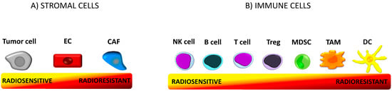 Tumor microenvironment (TME). TME is a functional and structural niche where tumor progression occurs. It consists of cellular and molecular (extracellular matrix, cytokines, chemokines, and other molecules) components. The microenvironment is composed of tumor stromal cells (cancer-associated fibroblast (CAFs), mesenchymal stromal cells (MSCs), endothelial cells (ECs), pericytes) and immune cells (T cells, B cells, natural killer (NK) cells, dendritic cells (DCs), tumor-associated macrophages (TAMs), tumor-associated neutrophils (TANs), myeloid-derived suppressor cells (MDSCs)) [6]. The cells differ in radiosensitivity. The term “radiosensitivity” means the relative susceptibility of cells to radiotherapy (RT)-induced irreversible damage such as chromosomal instability and cell death [37]. (A) Proliferating tumor cells are sensitive to irradiation (IR) [37]. Endothelial cells are resistant to doses up to 10Gy. CAFs are the most resistant stromal cells. (B) Within the cells of the immune system regulatory T cells (Tregs) are more radioresistant than any other population of T cells [38] and B cells [39]. NK cells and B lymphocytes are the most radiosensitive immune cells, while DCs are the most resistant [40].