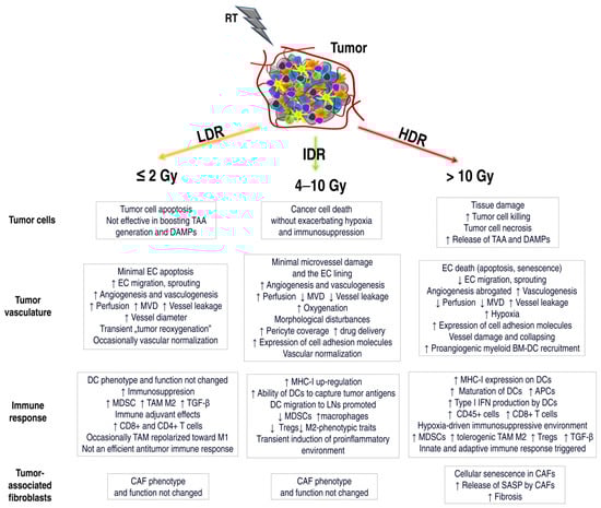 Changes in vascularization after irradiation depend on the total dose, fractionation, type, location, and stage of the tumor progression [56]. Low doses of RT can normalize vessels, which facilitates the infiltration of T-lymphocytes into the tumor and the anti-tumor response [33,97]. The low-dose regimen may also stimulate the process of angiogenesis and neovascularization [66], while high doses might hamper these processes [13]. Because proangiogenic IR effects in low doses seem to be rapid and transient, daily administration of 2 Gy may repeatedly stimulate the angiogenesis process [13]. During fractionated radiotherapy, “tumor reoxygenation” may also occur when hypoxic cancer cells obtain better access to oxygen. Better distribution of oxygen in the vessels after previous fractions contribute to increased tumor cell death [127,133].