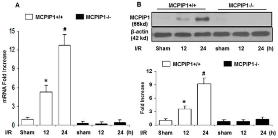 2.1. MCPIP1 Is Up-Regulated in the Murine Brain Subjected to Transient Focal Ischemia/Reperfusion (I/R) Injury