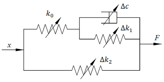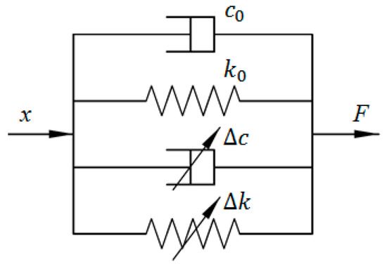 Zhao et al. adopted the classical Kelvin–Voigt model to portray the viscoelastic characteristics of MRE-based bearings [21], the schematic of which is shown in Figure 1. In this model, the springs are connected to the dashpots in parallel to illustrate the nonlinear force–displacement relationship, where k0 and c0 respectively denote the zero-magnetic stiffness and damping, while ∆k and ∆c respectively represent magnetic stiffness and damping. The relationship between output force F and displacement x can be expressed using the following equation: