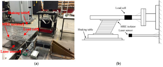 The performance of the MRE isolator was evaluated and characterized by a series of experimental tests utilizing the experimental setup depicted in Figure 11. The isolator, either in dynamic or quasistatic mode, was applied with horizontal loadings that were provided by a shaking table, where the MRE isolator is mounted and moves along the same motion. The lateral load applied to the isolator is measured by a load cell that was installed to a fixed reaction rig. A laser sensor was installed parallel to the shaking table to measure the displacement response. In order to eliminate the undesired inertia force in the measurements, the top plate of the MRE isolator and the load cell remained motionless during the test process. A DC power supply with the capacity of 240 V and 5.3 A was utilized to provide DC current to energize the magnetic coil. During the testing, the current applied to the magnetic coil was adjusted by a slider and the current output from the slider was monitored by a multimeter.