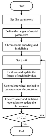 To solve the optimization problems for optimal model parameters, evolutionary optimization algorithms can be considered because of independent requirements on derivative and analytic model expressions [39]. To date, several swarm-based algorithms have been successfully employed in model parameter optimization of MR fluids dampers, including particle swarm optimization (PSO) [40], genetic algorithm (GA) [41,42], fruit fly algorithm (FFA) [43], charged system search (CSS) [44], enriched imperialist competitive algorithm (EICA) [45], differential evolution (DE) algorithm [46], etc. However, solving the optimization problems for MRE devices are rarely reported. Zhu et al. adopted least square (LS) method to identify the magneto-viscoelastic model of MRE device [47]. Yang et al. utilized the GA to identify the Bouc–Wen model for MRE isolator [31]. Similarly, PSO and FFA have been applied in model identification of MRE devices [33,48]. Among existing methods, the GA is the most commonly used due to its benefits of easy coding and fast convergence [49,50]. Accordingly, in this study, it is selected to solve the optimization problem for model parameter identification of the MRE device. The procedure of using GA to identify model parameters of the MRE device is summarized as follows, and is shown in Figure 14.