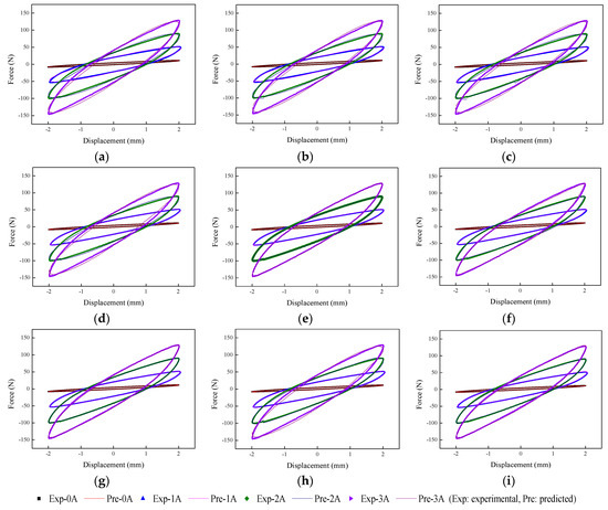 Regression analysis of the phenomenological models. (a) Kelvin–Voigt model, (b) four-parameter viscoelastic model, (c) rheological model, (d) BW model, (e) improved BW model, (f) Dahl model, (g) improved LuGre friction model, (h) strain stiffening model, and (i) hyperbolic hysteresis model.