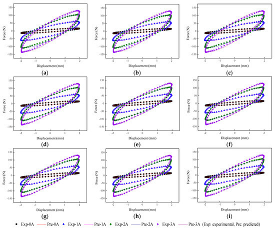 Figure 12 shows an example of testing result, which demonstrates typical force–displacement/velocity responses of the MRE isolator when the excitation frequency is 4 Hz, the amplitude is 8 mm, and the applied current is 2 A. It is clearly observed that the device displays hysteretic loops in the shear force–displacement/velocity responses, which has the characteristic of strain stiffening under the influence of external current, as illustrated in previous studies. The interpretation of the phenomenon of strain stiffening is put down to the fact that the polymer chain has very constrained ductility for the natural rubber. Apart from the impedance from the polymeric matrix, the ferromagnetic particles are constrained by the interaction forces from neighboring ferromagnetic particles due to the magnetic field. This will lead to the reduced movement of the polymer chain. When the MRE is under low current conditions or in the absence of current, the phenomenon of strain stiffening is minimal and the MRE shows linear viscoelastic feature represented by a hysteretic ellipse loop. The amplitude and shape of the force–displacement/velocity loop are related to the loading amplitude and rate as well as the applied current level. Hence, the phenomenological models for the MRE device should be able to track the change of the hysteresis loop caused by loading condition. Based on the experimental data, the performances of nine models are evaluated and compared, the results of which will be specifically provided in Section 4.