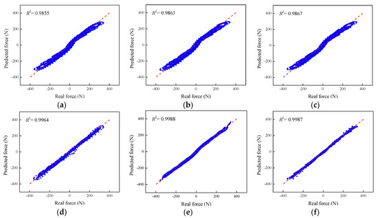 Figure 30 shows the regression analysis results of the phenomenological models to predict the force of the MRE device with all the loading conditions. It is apparently observed from the figures that all the data points are evenly distributed on both sides of the regression line, which indicates the perfect matching degree between experimental measurements and predicted forces from phenomenological models. In regard to the coefficient of determination, the corresponding values of all the models are above 0.97. Accordingly, the numerical results from all the phenomenological models satisfactorily accord with the experimental results. Particularly for the improved BW, Dahl, improved LuGre friction, strain stiffening, and hyperbolic hysteresis models, their R-squared values are above 0.99, indicating high modeling accuracy.