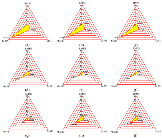 Statistical evaluation indices of phenomenological models. (a) Kelvin–Voigt model, (b) four-parameter viscoelastic model, (c) rheological model, (d) BW model, (e) improved BW model, (f) Dahl model, (g) improved LuGre friction model, (h) strain stiffening model, (i) hyperbolic hysteresis model.