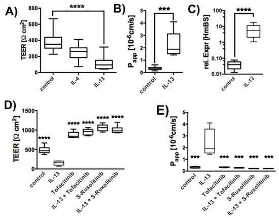 IL-13 increased paracellular permeability. Human tracheal epithelial cells were cultivated at air-liquid interface conditions in the absence (control) and presence of 10 ng/mL IL-13 (IL-13). Box plots summarize data as median values, the boxes represent percentiles, the whiskers indicate the minimum/maximum. (A) Response of human tracheal epithelial cells to TH2 cytokines IL-4 and IL-13 (10 ng/mL each). Both cytokines reduced TEER. However, TEER reduction by IL-4 did not reach significance (Kruska-Wallis test with Dunn’s correction for multiple testing, p = 0.086, IL-4 (N = 8) versus control cells (control), N = 20). IL-13 reduced TEER significantly (Kruska-Wallis test with Dunn’s correction for multiple testing, p < 0.0001, IL-13, N = 17 versus control, N = 20). (B) IL-13 increases apparent permeability coefficient (Papp) for the small molecular marker sodium fluorescein (Mann-Whitney test, p = 0.0002, N = 7). Inhibition of JAK/STAT pathway by Tofacitinib and S-Ruxolitinib abolishes IL-13 induced effects on (C) Relative Expression of Muc5ac in human tracheal epithelial cells. Upregulation of mucus production was confirmed by detecting Muc5ac upregulation in IL-13 treated epithelia. (D) TEER of control epithelia (control), epithelia cultivated in the presence of IL-13 (IL-13), 2.5 µM Tofacitinib (Tofacitinib) or S- Ruxolitinib (S-Ruxolitinib) and in the presence of IL-13 + Tofactinib or IL-13 + S- Ruxolitinib. (all versus IL-13, ANOVA with Holm-Sidak correction for multiple testing, p < 0.0001, N = 6) and on (E) Papp (all versus IL-13, ANOVA with Holm-Sidak correction for multiple testing, N = 4, control p = 0.0003, Tofacitinib p = 0.0003, Tofacitinib + IL-13 p = 0.0002, S-Ruxolitinib p = 0.0002 and S-Ruxolitinib + IL-13 p = 0.0002). *** and **** indicate p < 0.001 and p < 0.0001, respectively.