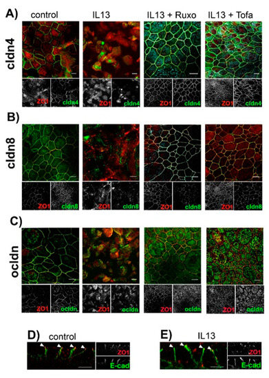 To further elucidate the mechanisms underlying the IL-13-induced modulation of paracellular permeability, we investigated the cellular localization of TJ proteins (Figure 3A–C). We focused on cldn8, since we recently identified cldn8 as a claudin that regulates protein assembly at the TJs [37]. Cldn4 was chosen as the control, as its expression level is not modulated by neither IL-13 treatment nor inhibitors of JAK/STAT signaling (see above). Finally we investigated ocldn localization, since there is evidence that its localization at TJ in pulmonary epithelia is modulated by cldn8 [37]. In control epithelia, all the investigated TJ proteins colocalized with tight junction marker zonula occludens 1 (ZO1) (Figure 3A–C). Staining for TJ proteins revealed an almost continuous contouring of the cells, indicating their lateral assembly at the TJs. IL-13 treatment resulted in a highly diminished lateral localization of all TJ proteins, including ZO1. In these epithelia, the staining of TJ proteins resulted in a patchy cell contouring that indicates massively impaired protein assembly at the TJ. Moreover, TJ proteins were observed to form intracellular aggregates. This effect was not restricted to IL-13 regulated cldn8 but to all investigated TJ proteins, including ZO1. Inhibition of JAK/STAT signaling using 2.5 µM Tofacitinib [32,33] or 2.5 µM S-Ruxolitinib [34,35] abolished IL-13 induced intracellular localization of TJ proteins. Whereas TJ protein localization was affected by IL-13 treatment, the lateral localization of the adherens junction protein E-cadherin (E-cad) [38] remained almost unaffected by IL-13 (Figure 3D,E). This indicates that the IL-13 effect on cell–cell contacts is restricted to the TJ. Furthermore, IL-13 affects all TJ proteins but not exclusively those proteins, which are regulated at transcriptional levels by IL-13 treatment.