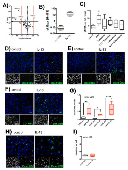 Ubiquitination of TJ proteins. Human tracheal epithelial cells were cultivated at air-liquid interface conditions in the absence (control) and presence of IL-13 (IL-13). (A) Screening for ubiquitin activating E1 and ubiquitin conjugating E2 enzyme by semi-quantitative RT-PCR. Volcano plot summarizes changes in expression levels (control vs. IL-13, each N = 3). Log2 fold changes are given as mean values. Vertical red lines give threshold of ±1.5 fold change. Horizontal black line gives threshold of p = 0.05. Genes that were considered to be up regulated are depicted in red (UBE2Z) and those to be down regulated are given in blue (BRCA1, UBE2T, UBE2E1). (B) Upregulation of UBE2Z by IL-13 was confirmed and effect of JAK/STAT pathway inhibition was tested in subsequent independent experiments. Relative expression of UBE2Z to HmBS of: control epithelia (control, p = 0.021), epithelia cultivated in the presence of IL-13 (IL-13), 2.5 µM Tofacitinib (Tofacitinib, p = 0.035) or S- Ruxolitinib (S-Ruxolitinib, p = 0.16) and in the presence of IL-13 + Tofactinib (p = 0.16) or IL-13 + S- Ruxolitinib (p = 0.09). All versus IL-13 and N = 6, ANOVA with Holm-Sidak correction for multiple testing. (C) IL-13 stimulation of epithelia used in “B” was confirmed by detecting Muc5ac upregulation (Mann-Whitney test N = 6, p = 0.004). Ubiquitination of TJ proteins were investigated in proximity ligation assays for (D) ubiquitination of claudin 4 (cldn4 UBQ, green channel, (E) ubiquitination of claudin 8 (cldn8 UBQ, green channel) and (F) ubiquitination of ZO1 (ZO1 UBQ, green channel). Nuclei were counterstained by Hoechst 33342 (blue channels). (G) PLA positive structures were identified as green fluorescent particles with an area of 75 µm2 and above. Box plot summarizes quantification of PLA positive structures per cell as median, boxes represent percentile and whiskers give minimum/maximum (IL-13 versus control, Anova test with Holm-Sidaks correction for multiple testing, all N = 4, ZO1 p = 0.0014, cldn4 p = 0.03 and cldn8 p < 0.0001). (H) Ubiquitination of E-cadherin (E-cad UBQ, green channel). (I) PLA positive structures per cell summarized as median values, boxes represent percentiles and whiskers provide minimum/maximum values (E-cadherin = E-cad, ubiquitin = UBQ). No difference in PLA signal abundance could be detected in control versus IL-13 treated cells (N = 4, Mann-Whitney test p > 0.9999). *, ** and **** indicate p < 0.05, p < 0.01 and p < 0.0001, respectively. Scale bars in (D–F) and (H) represent 10 µM.