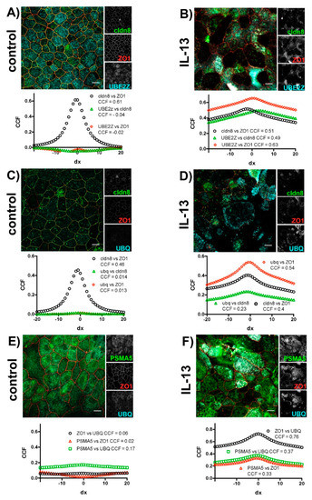 We investigated the intracellular localization of TJ proteins and markers of the ubiquitin-proteasome pathway in subsequent immunocytochemical experiments (Figure 5) and studied their colocalization using van Steensel’s cross-correlation analysis [46]. In control cells, the investigated TJ proteins cldn8 and ZO1 colocalized (Figure 5A,C), resulting in a sharp peak when cross-correlation coefficients were plotted against lateral translocation. Hardly any colocalization could be observed in control cells for the TJ proteins with UBE2Z (Figure 5A) or UBQ (Figure 5C). The exposure of epithelia to IL-13 resulted in an overlapping localization of TJ proteins with UBE2Z (Figure 5B) as well as with UBQ (Figure 5D). In these cases, the van Steensel’s plots revealed increases in the cross-correlation coefficients for all invested proteins. However, the broadening of peak when cross-correlation coefficients are plotted against the lateral translocation reflects the increased and inhomogeneous size of structures where TJ proteins, UBE2Z and UBQ colocalize. No colocalization of ZO1 with the proteasomal marker PSMA5 nor with UBQ or PSMA5 with UBQ could be observed in control epithelia (Figure 5E). In IL-13 treated epithelia (Figure 5F) ZO1 colocalized with UBQ and PSMA5. In these epithelia UBQ colocalizes with PSMA5 as well. Again van Steensel’s plot revealed enlarged non-homogenous size of structures at which colocalization is detected.