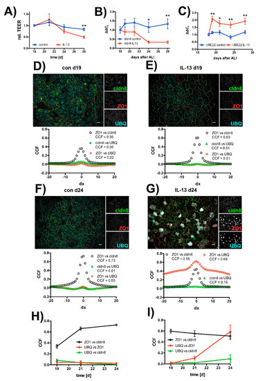 In case of IL-13 treated epithelia, the cross-correlation coefficient for the colocalization of cldn8 with ZO1 did not change over time. In contrast to that and to control cells, cross-correlation coefficients for UBQ colocalization with ZO1 and cldn8 both increase, starting three days after IL-13 exposure, from day 21 onwards. However, the change in colocalization for cldn8 with UBQ was smaller compared to ZO1 with UBQ (Figure 6I) and most likely reflects a weaker staining efficiency and/or protein abundance of cldn8.