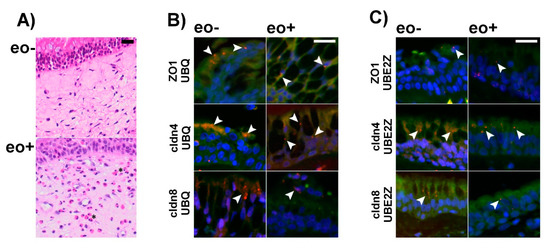 Proximity ligation assays (PLA) were performed on formalin fixed and paraffin embedded tissue from the sinunasal tract containing respiratory type epithelium of patients with and without eosinophilic inflammation. (A) shows representative Hematoxilin and Eosin stained images from nasal mucosa with (eo+) and without (eo−) eosinophilic inflammation. Eosinophilic granulocytes can be detected as reddish stained cells in eo+ mucosa (examples are highlighted by asterix) but were not detected in eo- mucosa. For the PLA merge images of nuclear counterstain (blue), autofluorescence (green) and PLA signals (red) are shown. Antibodies specific for ZO1, Claudin 4 and Claudin 8 were combined with antibodies detecting Ubiquitin (A) and Ube2Z (B). Specific PLA reaction signals (depicted by arrow heads) can be detected in the epithelium under all conditions, suggesting association between ZO1, Claudin 4 and Claudin 8 with Ubiquitin and UBE2Z respectively. Scale bars are 20 µm in panels (A–C).