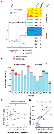 Annotation of the UPS members in Brassicaceae and Poaceae. (A) Phylogenetic relationship of 13 selected species. The tree topology and whole genome duplication events were inferred from literature [29,35]. The age rank is assigned for ordering purpose based on the split time of each species as defined in literature [29]. Species abbreviations in this panel and others are described in Table S2. (B) Comparison of the UPS sizes across 13 plant species. (C) No correlation is present between the genome size and the UPS size in the 13 plant genomes analyzed. Mbp: million base pair. (D) A significant correlation is present between the number of new pseudogenes with the number of new peptide loci in the UPS group of the 13 plant genomes.