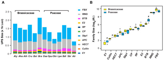 Varied size expansion of the UPS gene families in 13 plant genomes. (A) Size comparison of 11 UPS gene families in 13 plant genomes. A schematic diagram of 11 UPS gene families analyzed in this panel and others is described in Figure S1. (B) Unequal expansion of 11 UPS gene families in Brassicaceae and Poaceae. Single asterisks indicate that the size of the family is larger in Brassicaceae than that in Poaceae. Hash symbols dedicate a larger family size in Poaceae than in Brassicaceae. Statistical significance was performed based on Wilcoxon rank sum test (p < 0.05).