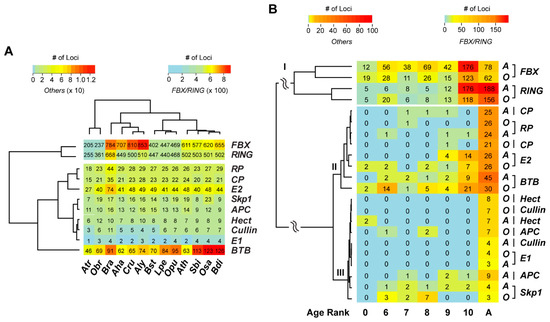 To understand why the UPS gene families varied in size in the two distant plant families, we assigned the UPS members in Aly and Osa at different age ranks based on the emerging time of their orthologous groups within Brassicaceae and Poaceae, respectively. We then analyzed the size expansion of the aforementioned 11 UPS families at each age rank in these two genomes (Figure 1A). Based on the number of orthologous genes at each age rank, the 11 UPS families can be clustered into three groups (Figure 3B). The FBX and the Really Interesting New Gene (RING) families form the largest group (Cluster I), followed by Cluster II that contained four medium size families, which are proteasome core particles (CPs), RPs, BTBs, and E2s. The remaining five gene families, E1, APC, Homologous to the E6-AP Carboxyl Terminus (HECT), Cullin, and S-phase kinase-associated protein 1 (Skp1), were grouped into Cluster III. Among these three clusters, only the FBX and the RING family members and the Osa BTB family members are present in different age ranks, while the other families lack members in young age ranks, particularly those from Cluster III. Not surprisingly, the sizes of UPS families in Cluster III are small and some, such as E1 and Cullin, are conserved and play essential roles in the ubiquitylation pathway [2,19]. Furthermore, most UPS family members are present in the aged groups (Age (Rank) 10 and A), suggesting that the UPS was largely expanded before flowering plants split. Interestingly, the size differences in UPS families between Brassicaceae and Poaceae is roughly reflected by the number variance of family members in these two aged groups. For example, consistent with the higher number of FBX, RP, and APC members in Brassicaceae than that in Poaceae, members from Ages 10 and A are also more enriched in Aly than that in Osa. Conversely, Osa encodes more E1 and Cullin loci than Aly within these two age-ranks as seen at the corresponding plant family level (Figure 2B and Figure 3B). However, young duplicated BTB members seem to contribute more significantly in expanding the size of the BTB gene family in Osa (Figure 3B), suggesting the presence of differential expanding mechanisms.