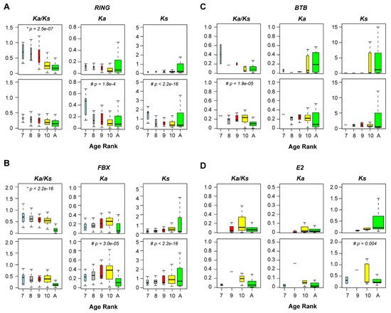 Evolutionary selection analysis of age-ranked orthologous genes from four large UPS gene families. Age ranked orthologous Aly–Ath (top panel) and Osa–Obr (bottom panel) pairs were retrieved as in Figure 3B and subject to codeml analysis in PAML4 [40] with a Ka/Ks free model. The values of Ka/Ks, Ka, and Ks of each pair of RING (A), FBX (B), BTB (C), and E2 (D) orthologous genes were grouped and plotted using boxplot in R. Age rank is described in Figure 1A. Single asterisks and hash symbols indicate that the corresponding values in Aly–Ath orthologous pairs from ages seven to 10 are greater or less than that in Osa–Obr pairs within the same age ranks, respectively. Statistical significance was performed based on Wilcoxon rank sum test (p < 0.05). The width of each boxplot is proportional to the number of orthologous pairs.