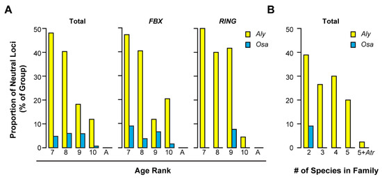 Neutrality test revealed a significant proportion of pseudogenes in Aly–Ath UPS orthologous pairs. (A) Age-ranked orthologous Aly–Ath and Osa–Obr pairs were retrieved as in Figure 3B and subjected to neutrality analysis as described in Section 4. The proportion of neutrally evolving loci was plotted against age ranks. (B) Non-age-ranked Aly–Ath and Osa–Obr pairs were retrieved based on the number of species present in the same orthologous group from Brassicaceae and Poaceae, respectively. Each pair was subjected to neutrality analysis as in (A). The proportion of neutrally evolving loci was plotted against the number of species present in each orthologous group.