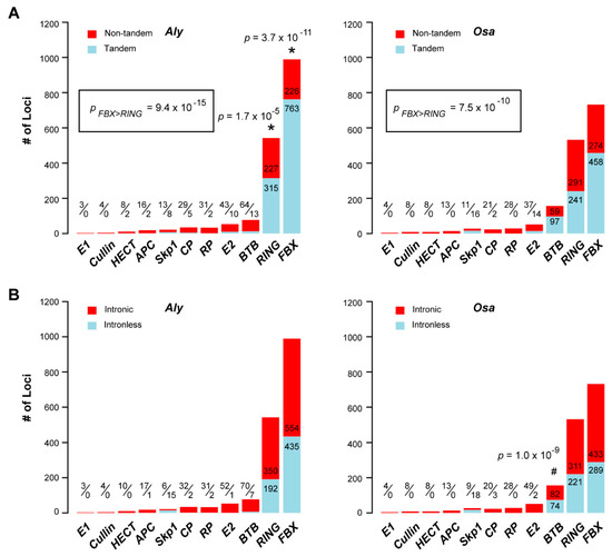Comparison of the role of recent duplications in expanding the sizes of 11 UPS gene families in Aly and Osa. (A) Tandem duplication plays a more significant role on the expansion of the FBX and RING gene families in Aly than in Osa, and vice versa for the BTB family. In both genomes, more FBX genes were tandemly duplicated than RING members. The sizes of tandem and non-tandem loci are indicated either in the denominator and numerator of a fraction, respectively, or directly on the bar plot. (B) Significantly more intronless BTB loci were found in Osa than in Aly but not others. The sizes of intronless and intronic loci are indicated either in the denominator and numerator of a fraction, respectively, or directly in the bar plot. Single asterisks indicate a significant enrichment of tandem duplications in Aly. Hash symbols denote a significant enrichment of tandem duplications or intronless genes in Osa. Inset shows the enrichment comparison of tandem duplications between the FBX and the RING families in Aly and Osa genomes. Statistical significance was performed based on Fisher’s exact test and the p values are indicated.