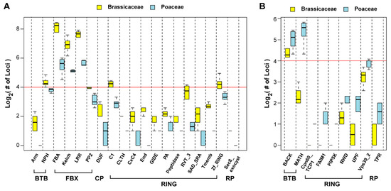 Domain enrichment assay revealed biased expansion of UPS subfamilies in Brassicaceae and Poaceae species analyzed. (A) Boxplots show 19 UPS subfamilies with a significantly more loci in Brassicaceae than in Poaceae. (B) Nine UPS subfamilies are shown to be enriched in Poaceae compared to Brassicaceae. Statistical significance was performed based on Student’s t-test (p < 0.01).