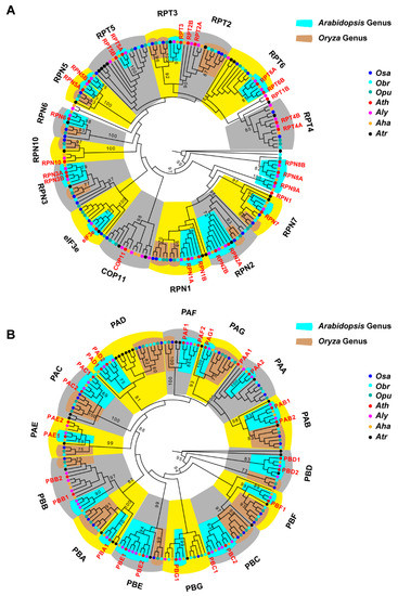 Phylogenetic analyses uncovered diversifying evolution of the 26S proteasome in Arabidopsis and Oryza genera. (A) Phylogenetic relationship of 9 RPN and 6 RPT subunits. (B) Phylogenetic relationship of the complete set of CP subunits. In each panel, the sequences of each member were annotated and subjected to a maximum likelihood phylogenetic analysis as described in Section 4. Detailed sequence IDs are described in Figures S3 and S4. The name of an Ath isoform is indicated in red. Subunit clades are alternately shaded with yellow and gray color. Statistical significance equal to or greater than 60% of 1,000 bootstrap re-samplings is indicated in a node that separates a significant clade. Significant clades from Arabidopsis or Oryza genus only are shaded with light blue or brown color, respectively.