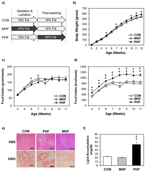 To assess the potential differential effects of HF exposure at different developmental stages, male rats were exposed to HF diet either during gestation and lactation (maternal high fat: MHF) or after weaning (post-weaning high fat: PHF) (Figure 1a). Additionally, a control group (CON) was fed an AIN93G diet during both the perinatal and post-weaning periods. Food intake in grams per week was not significantly different between the three groups, except on week 6 and 7, when CON animals consumed more than PHF rats (Figure 1c). However, given the higher caloric density of the HF diet, the PHF group consistently consumed more calories during the post-weaning period than both CON and MHF (Figure 1d). PHF rats were only significantly heavier than CON, but not MHF, on post-natal weeks 5, 7, 10, 11 and 12 (Figure 1b). Food efficiency (weight gain/kcal intake) was lower in PHF compared to both CON and MHF (Figure S1). ORO staining revealed that lipid accumulation was unchanged in MHF compared to CON, but was significantly higher in PHF (Figure 1e,f). To account for differences in body weight and lipid accumulation, we measured expression of de novo lipogenesis and triglyceride synthesis genes and found decreased levels in PHF and increased levels in MHF (Figure S2).