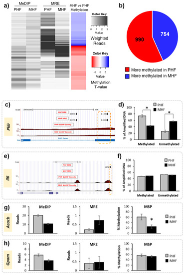 Methylation results were validated in multiple animals from each of the groups using both a probe-based PCR method and MSP. First, a DMR located within a gene of interest, pyruvate kinase (Pklr), was verified using a fluorescent probe-based PCR technique (Figure 2, Table 1). Using the fluorescent probe, we confirmed that the MeDIP- and MRE-identified DMR was highly methylated in PHF (74% methylated) when compared to MHF (43% methylated, Figure 2c,d). We used the same method to examine a genomic location upstream of the Il6 gene that was not differentially methylated according to MeDIP and MRE analysis. Probe-based analysis of DNA methylation confirmed this result, as the methylation in the MHF (48% methylated) and PHF (47% methylated) groups were not significantly different (Figure 2). Additionally, we used MSP to confirm that a region within the Acacb gene was differentially methylated between PHF and MHF rats (Table 1). PHF animals had higher methylation than MHF animals (70% and 25%, respectively; Figure 2). MSP also confirmed that a region in the Gpam gene was not differentially methylated, as predicted by MeDIP-seq and MRE-seq (PHF: 57%, MHF: 53%). Given the strict criteria set by the MethylMnM package and the results from the subsequent validation both in this study and in previous work [19], we assume that any MeDIP- and MRE-identified DMRs represent true differential methylation between groups.