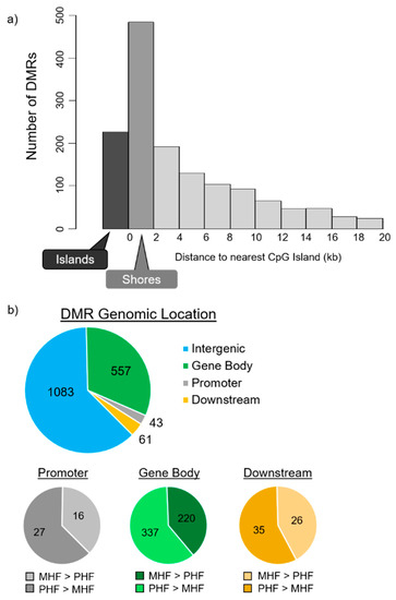 DMRs were then aligned with gene positions. Of the 1744 identified DMRs, 661 (38%) were associated with protein-coding genes (Figure 3b). Among the 661 gene-associated DMRs, only 43 were positioned within the 1500 bp upstream promoter region and 61 were in the 1500 bp downstream regions. The rest of the 557 gene-associated DMRs are located within intragenic regions. Furthermore, 37%, 40%, and 43% were more methylated in the MHF group than the PHF group, and 63%, 60%, and 57% were more methylated in the PHF group than the MHF group within the promoter, gene body, and downstream regions, respectively.
