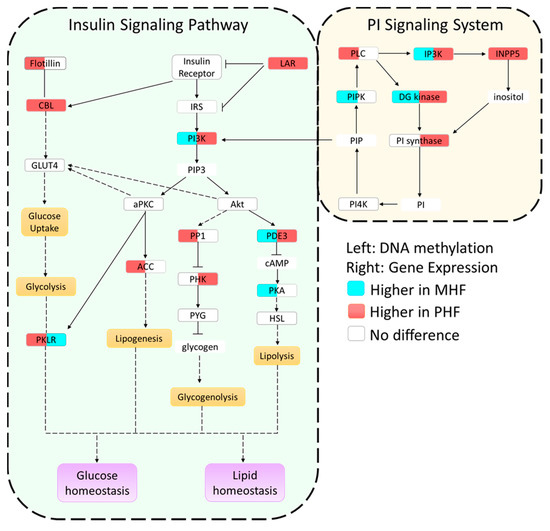 Summary of epigenetic and gene expression differences in the insulin and PI signaling pathways. Genes in each pathway are boxed and filled with two colors. The color in the left side of the box indicates methylation levels, while the color in the right side of the box denotes gene expression levels. White color signifies no change, blue color signifies higher methylation or expression in MHF animals, and red signifies higher methylation or expression in PHF animals. Yellow and purple boxes represent metabolic functions. A solid line represents a direct relationship, a dashed line represents a multi-step process, and compounds with no outline are other important signaling molecules.