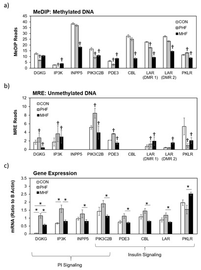 Differential gene expression in the insulin and PI signaling pathways. (a) Methylated DNA reads were measured using MeDIP-seq. † denotes a ≥15% difference between CON and either PHF or MHF. Data are presented as mean ±SEM across each DMR. (b) Unmethylated DNA was measured using MRE-seq. † denotes a ≥15% difference between CON and either PHF or MHF. Data are presented as mean ±SEM across each DMR. (c) Eight DMGs were significantly differentially expressed between MHF and PHF groups. The bar graph represents the mRNA quantity relative to B Actin. Data are presented as mean ±SEM. * p < 0.05.