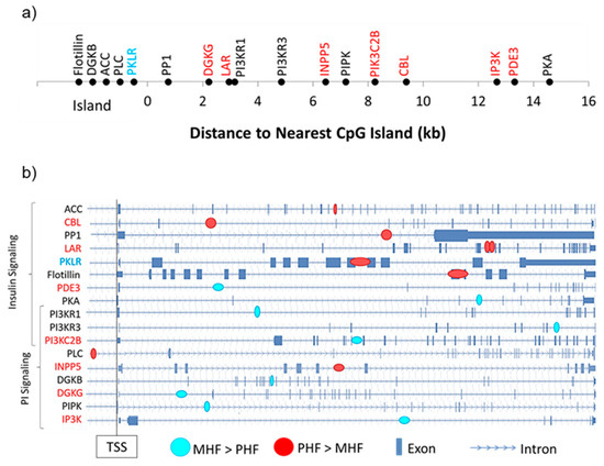 Genomic context of DMRs. (a) DMGs within the PI and insulin signaling pathways were mapped according to their distance from the nearest CpG island. Gene names in red and blue denote those that were more highly expressed in the PHF and MHF group, respectively. (b) Intragenic DMR position is shown for each DMG in the PI and insulin signaling pathways. Blue circles represent DMRs in which DNA methylation was higher in the MHF group. Red circles represent DMRs in which DNA methylation was higher in the PHF group. Gene names in red and blue denote those that were more highly expressed in the PHF and MHF group, respectively.