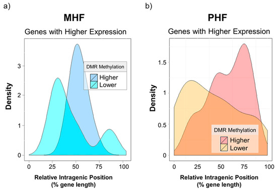 Gene expression is associated with intragenic DMR position. X-axis indicates intragenic DMR position relative to the gene’s transcription start site (x = 0) and transcription end site (x = 100). Y-axis represents the density of DMRs. (a) the density plot depicts DMGs that were more highly expressed in the MHF group. Higher gene expression in MHF was associated with lower DNA methylation in the middle of the intragenic region. (b) The density plot shows DMGs that were more highly expressed in the PHF group. Higher PHF expression was associated with higher downstream DNA methylation and lower DNA methylation near the TSS.