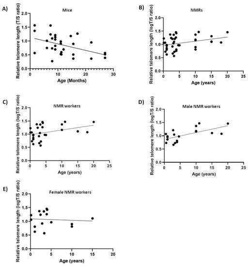 Relative telomere length (Telomere to Single copy gene (T/S) ratio) as a function of age in naked mole-rats (NMRs) and mice blood. The lines are the best-fit regressions through the data in (A) mice (slope = −0.02343, F1,29 = 7.741, p < 0.01, R2 = 0.2107); (B) NMRs (slope = +0.01538, F1,38 = 4.9691, p < 0.05, R2 = 0.1156); (C) NMR workers (slope = +0.01817, F1,27 = 4.672, p < 0.05, R2 = 0.1475); (D) male NMR workers (slope = +0.02571, F1,17 = 12.3, p < 0.05, R2 = 0.4197); (E) female NMR workers (not significant (ns)).
