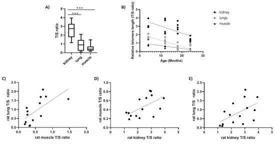 Relative telomere length (T/S ratio) in rat tissues. (A) range of relative telomere length (rTL) between all tissues (N = 16, p < 0.0001); (B) rTL as a function of age in kidney (slope = −0.08224, F1,16 = 13.78, p < 0.01, R2 = 0.4627), in lung (slope = −0.0752, F1,15 = 38.54, p < 0.0001, R2 = 0.7199) and in muscle (slope = −0.03385, F1,14 = 26.37, p < 0.01, R2 = 0.6532); (C) correlation between lung and muscle telomeres (p = 0.0395, r = 0.659); (D) correlation between kidney and muscle telomeres (p = 0.0278, r = 0.566); (E) correlation between kidney and lung telomeres (p = 0.0142, r = 0.535).