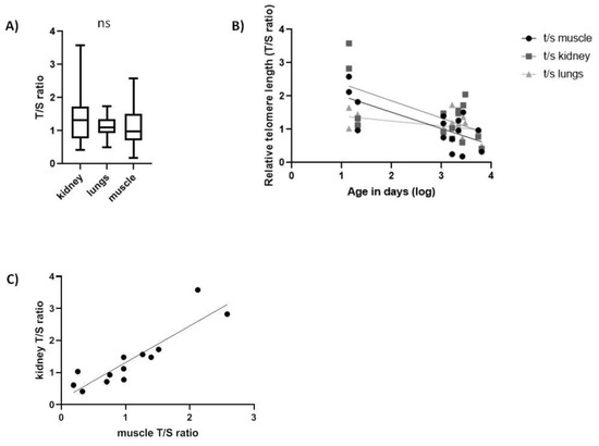 Relative telomere length (T/S ratio) in Spalax tissues. (A) range of rTL between all tissues (N = 15, ns); (B) rTL as a function of age in kidney (slope = −0.08451, F1,13 = 4.737, p < 0.05, R2 = 0.2671), in lung (slope = −0.03415, F1,14 = 5.759, p < 0.05, R2 = 0.2915) and in muscle (slope = −0.0706, F1,13 = 5.315, p < 0.05, R2 = 0.2902); (C) correlation between kidney and muscle telomeres (p = 0.001, r = 0.894).