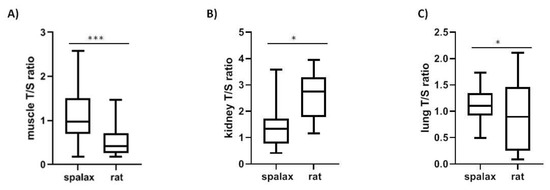 Telomere length in Spalax was longer in muscle and shorter in kidney compared to rats, (p < 0.01 muscle, p < 0.001 kidney) (Figure 4A,B). Furthermore, rTL differs significantly between Spalax and rat lungs (Figure 4C).